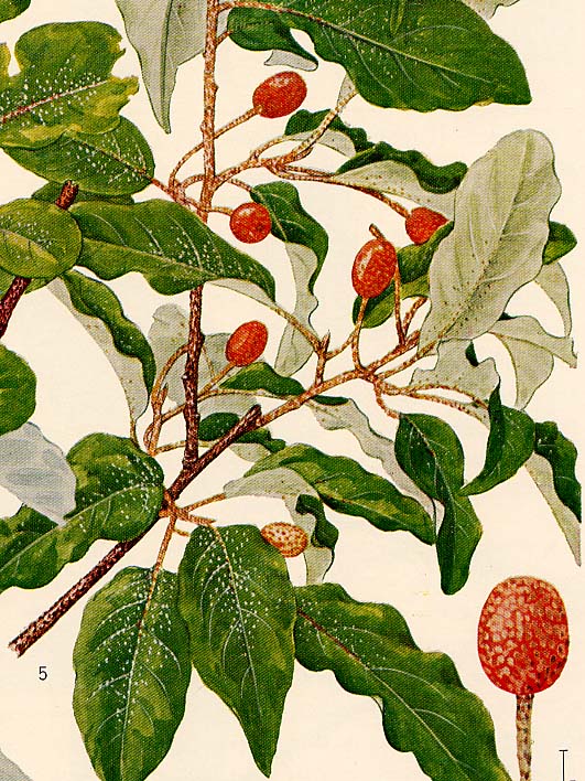 Leaves are alternate, chartaceous, entire but minutely undulate on the margin, silvery with dense scales beneath.