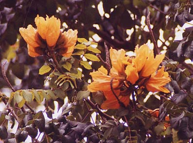 花は、橙赤色で縁は黄色。チューリップ形、7cmくらい。