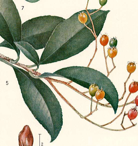 Leaves are alternate, thinly coriaceous, deep green and lustrous above. Young leaves are tinged red.