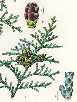 Leaves are scalelike somewhat acuminate with broader white X type markings below.